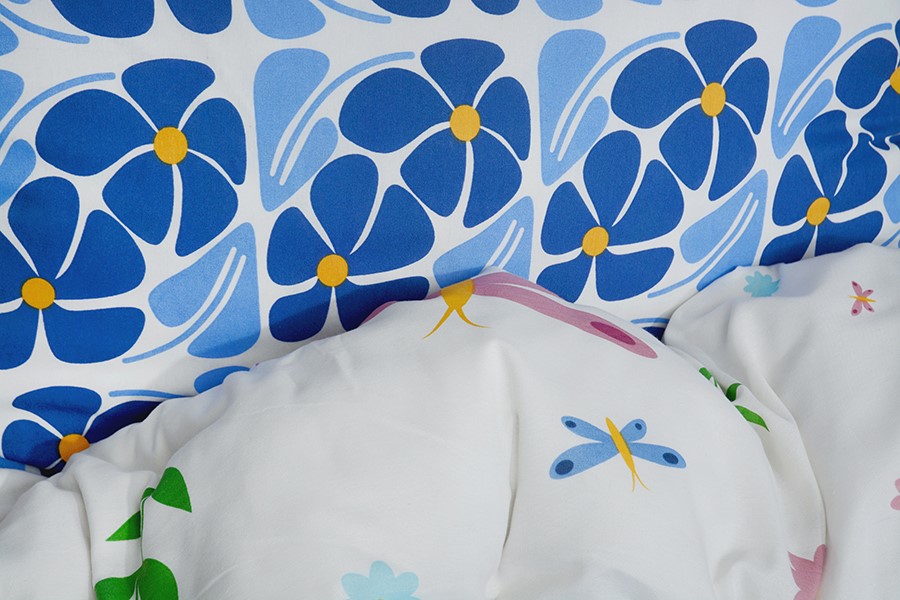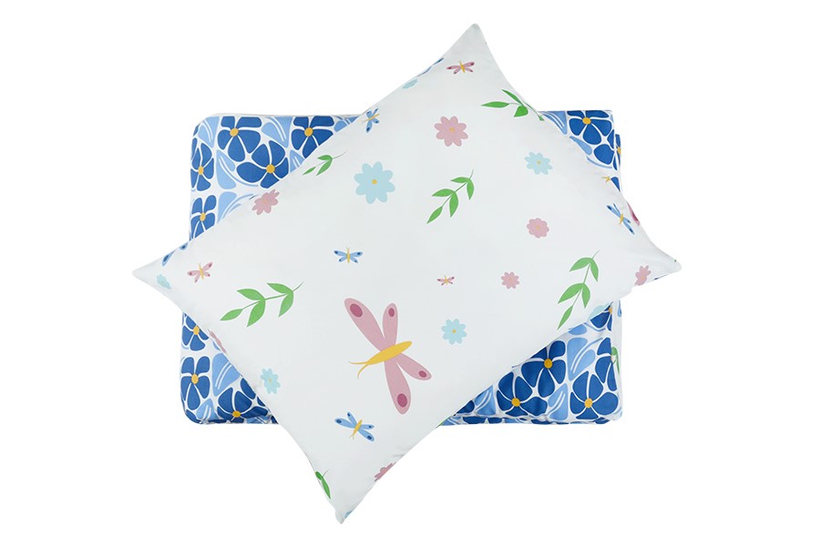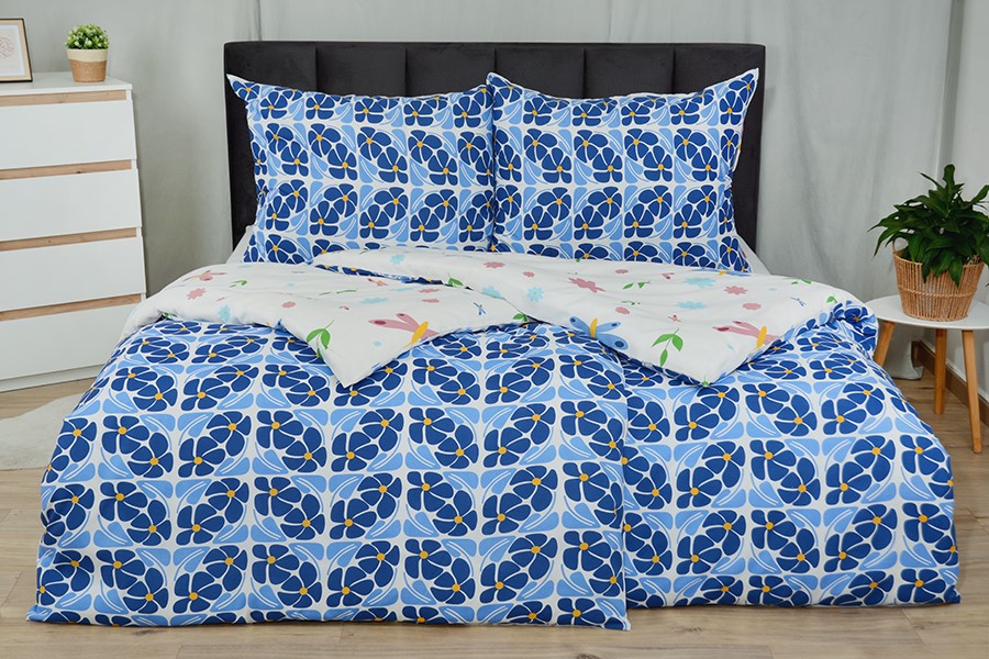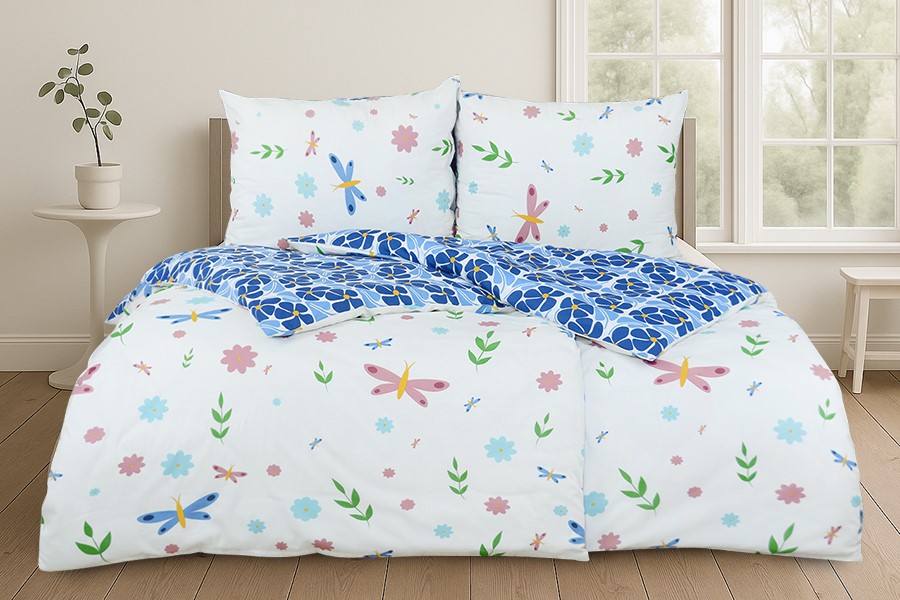 Bavlněné povlečení má oboustranný motiv. Jedna Jedna strana má motiv barevných motýlků, květů a lístků na bílém podkladu. Druhá strana má květinový motiv v modrých odstínech se žlutými středy na bílém podkladu. Povlečení je vyrobeno z bavlny PLUS, která se vyznačuje výbornou savostí a prodyšností. Je vhodné na jakékoliv roční období. Lehká příměs mikrovlákna přináší mnoho praktických výhod. Zaručuje jemnost, větší odolnost proti zmačkání a stálebarevnost materiálu, barvy proto zůstávají žívé a jasné i po mnoha praních. Povlečení má zapínání na zip. Svou postel dokonale sladíte, pokud zakoupíte froté nebo jersey prostěradla ve stejné barvě.