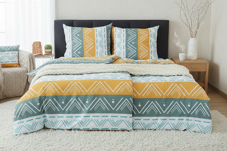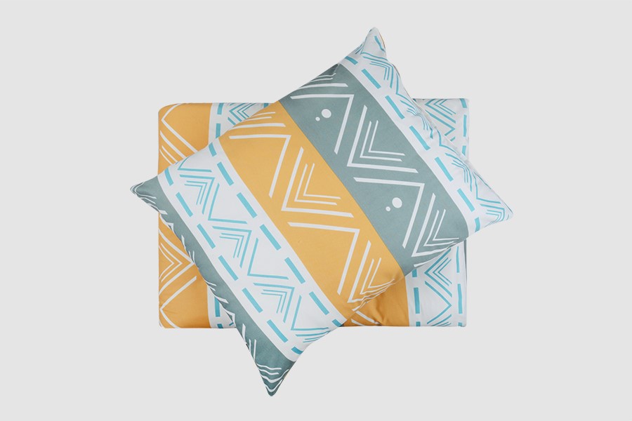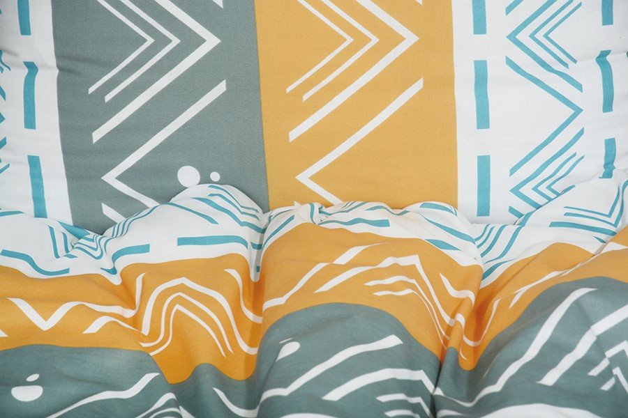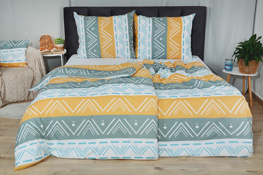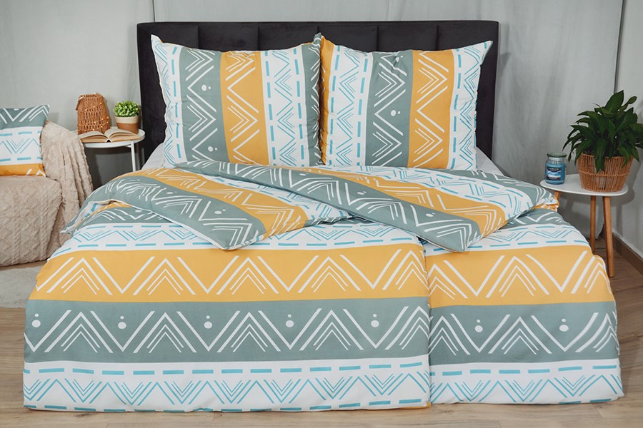 Bavlněné povlečení zdobí moderní geometrický motiv v bílé a tyrkysové barvě s elegantními liniemi a trojúhelníky, které se harmonicky střídají v pruzích bílé, okrové a šedé barvy. Povlečení je vyrobeno z bavlny PLUS, která se vyznačuje výbornou savostí a prodyšností. Je vhodné na jakékoliv roční období. Lehká příměs mikrovlákna přináší mnoho praktických výhod. Zaručuje jemnost, větší odolnost proti zmačkání a stálebarevnost materiálu, barvy proto zůstávají žívé a jasné i po mnoha praních. Povlečení má zapínání na zip. Svou postel dokonale sladíte, pokud zakoupíte froté nebo jersey prostěradla ve stejné barvě.